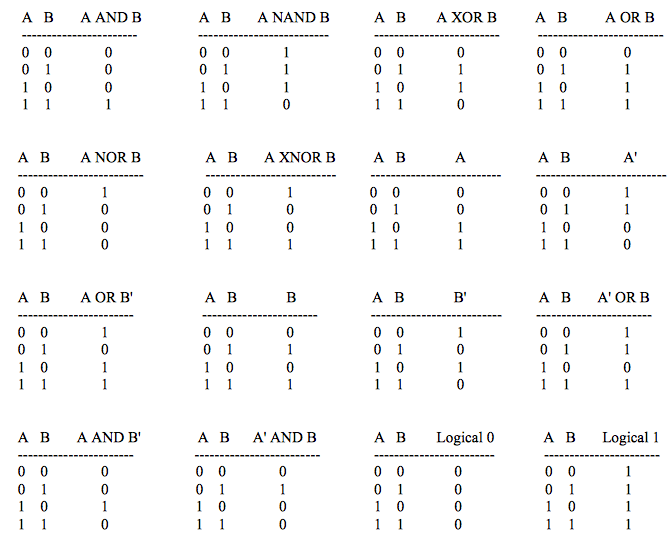 It is common for microprocessors to have an ALU that is capable of all 16 possible logical operations. Here are those operations:
