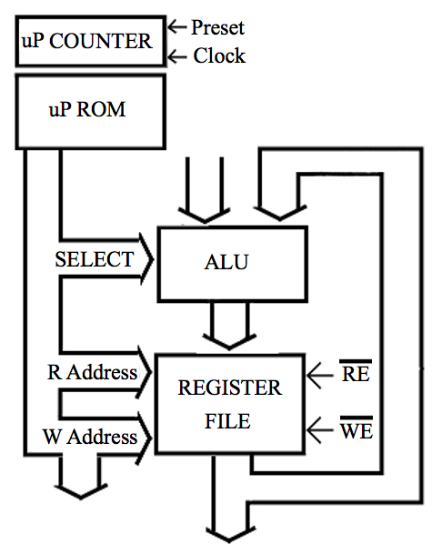 The uP ROM output selects the functions to be performed by the ALU and the register file. As indicated by the arrow in the lower left corner of the figure, some connections of the uP ROM output are not shown. These signals include the Preset input to the uP Counter, and the read enable and write enable to the register file. They are three of the outputs of the uP ROM.