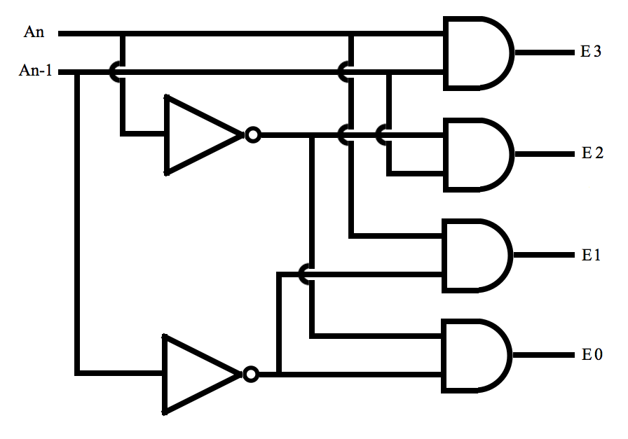 E0 would enable one of the memory locations and E1 would enable the other. They are never in the same state at the same time. If memory locations are accessed by an active high signal, only one enable signal is high at any given time. This is true of decoders of any size. Here is a decoder that enables one of four possible locations: