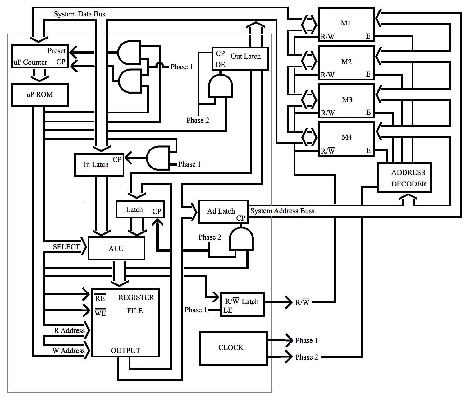 The address decoder in the figure above must enable one of four memory modules while Phase 2 is high. It must also disable all four memory modules while Phase 2 is low. This can be accomplished by adding another AND gate to each output and routing Phase 2 into one of the inputs of each of these. On the falling edge of Phase 2, all memory modules are disabled and it is the falling edge of each E (Enable Input) that finalizes what is placed in memory at the end of a write cycle. The falling edge of Phase two terminates a read cycle also, but a read cycle does nothing to the contents of memory.